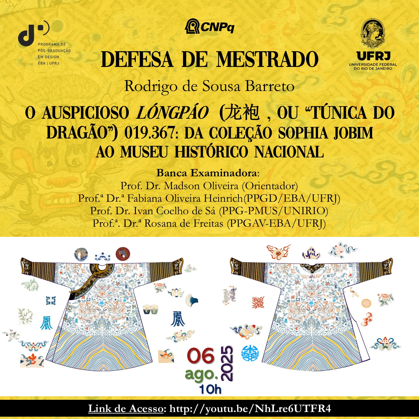 Esta dissertação apresenta o contexto histórico-cultural e a trajetória museográfica do item 019.367, o lóngpáo da categoria jífú (吉服, lit. “traje auspicioso” ou “traje festivo”), da Coleção Sophia Jobim (CSJ) do Museu Histórico Nacional (MHN). O trabalho se desenvolve a partir de três linhas argumentativas. A primeira apresenta a figura de Maria Sophia Jobim Magno de Carvalho (1904-1968) e contextualiza suas práticas colecionistas em relação a artefatos asiáticos. O debate é estruturado por meio de uma pesquisa histórica em documentos primários e secundários relacionados ao objeto de estudo e utiliza da teoria crítica orientalista para examinar como tais práticas colecionistas influenciaram na documentação deste traje chinês. A segunda linha evidencia uma revisão bibliográfica acerca da história e vestimentas da dinastia Qīng, com uma análise visual e estilística mais aprofundada do artefato investigado. O debate se expande, ainda, às noções de produção artística da China Imperial. Finalmente, a terceira abordagem parte da teoria crítica decolonial para tratar do MHN como “museu universal” e analisa o percurso museográfico da indumentária in situ, contrastando-o com práticas universalistas de diferentes instituições. Como contribuições, propõe-se uma revisão catalográfica da peça, pranchas gráficas detalhadas de seus elementos estéticos, simbólicos e técnicos e uma proposta de projeto museográfico que contextualiza o artefato dentro de uma perspectiva decolonial alinhada ao conceito de “Ásia-América-Latina como Método”. A conclusão destaca a urgência da reinserção crítica do objeto na expografia do MHN a fim de alcançar uma museografia mais assertiva, ética e intercultural.